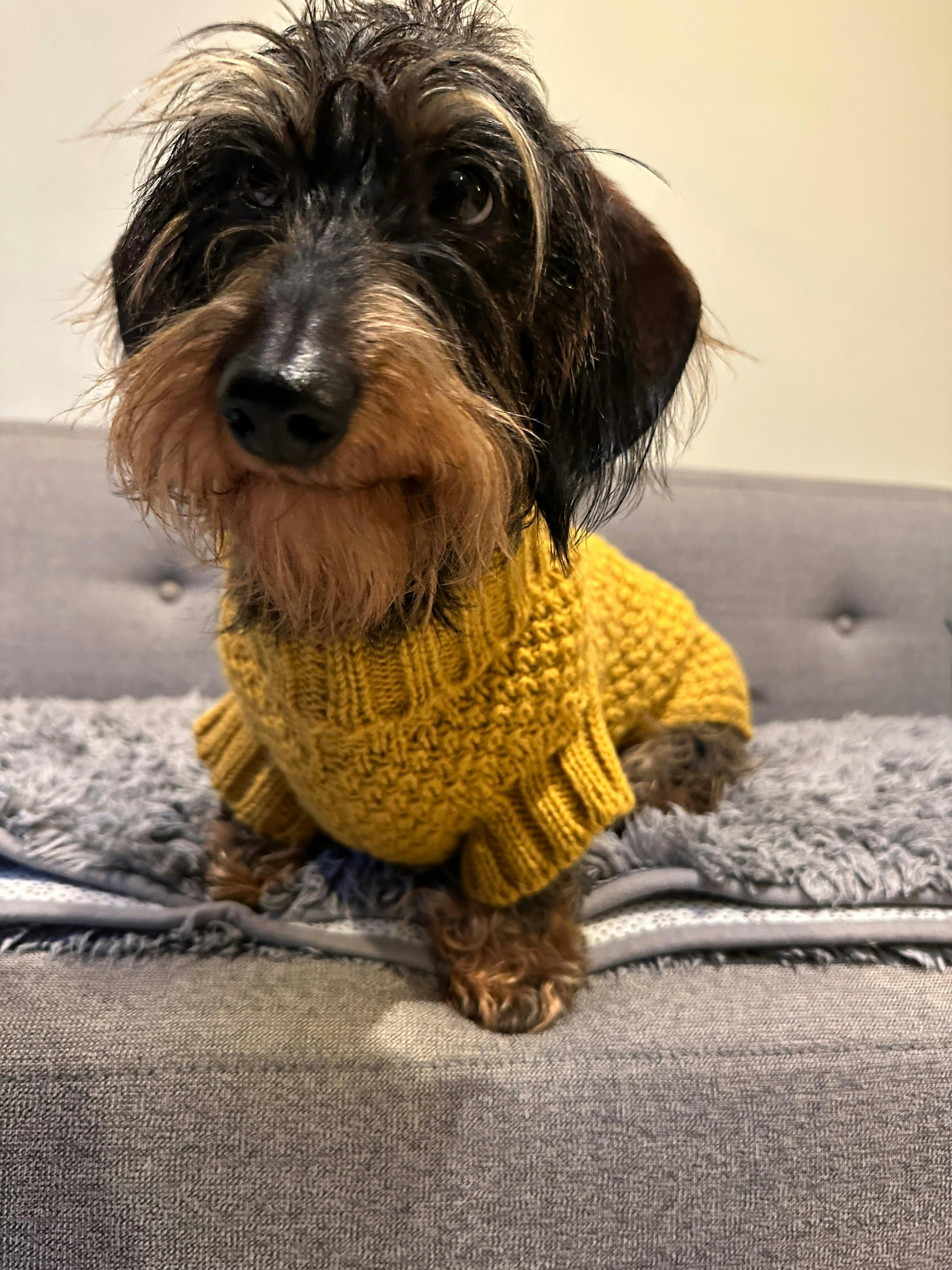 The Allen Bobble Mustard Yellow real wool dog jumper comes in Small, Medium Short, Medium and Large sizes. Please spend a moment to measure your dog and check the size guide so that you get the best fit. Your dog jumper is easy to keep clean. To keep your dog's jumper for a lifetime, simply hand wash using a non bleach detergent and re-shape while damp.