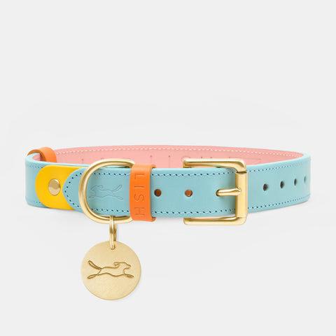 Unique to LISH London, the Spencer Powder Blue luxury dog collar was designed by Britain’s leading dogwear designer Lilly. Each collar is cut and stitched by hand by skilled British saddle makers.