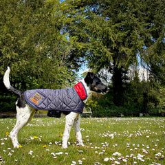 Our coats are renowned for their durability and quality. The Elwin Navy designer dog coat has a red contrast lining, it's durable outer woven using breathable yarns. Quilted using wadding that is made from 65% recycled fibres this sustainable dog coat is designed by our Creative Director Lilly Shahravesh. Now this all-season raincoat been updated, improved with a smart hindquarter pocket, LISH badge and brass press studs