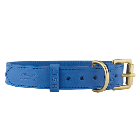 Countless hours go into hand-crafting each Coopers Cobalt Blue designer dog collar from the finest Italian Leather and hand-crafted in the UK. The difference is in the details, from sturdy solid brass fittings, an extra loop to keep the leather tip flat and neat and the new LISH imprint – the hallmark of quality and luxury. The Coopers Cobalt Blue Leather dog collar is designed by Lilly and cut by skilled British saddle makers.