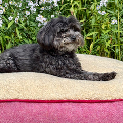 For the ultimate in hand-crafted luxury, treat your dog to a designer dog bed in our signature Harris Tweed specially designed by LISH. The Rose Pink luxury Dog Bed has supersoft Harris Tweed sides and base with  a cosy, hardwearing lamb fleece on top. We make the beds here in London, cutting and pinning the fabric and finally sewing on the appliqué details all by hand.