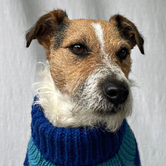 The Smithy Cobalt Blue Polo Neck Dog Sweater in vibrant chunky stripes, and a ribbed neck and hem. Inspired by our Creative Director Lilly Shahravesh's love of Dennis the Menace and his naughty pet dog Gnasher from the Beano Comic Books of her childhood. Match up your hound with the Coopers Cobalt Blue Dog collar and lead.